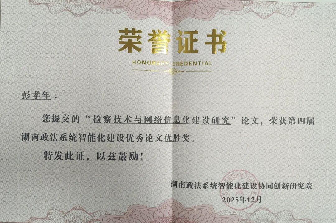 近日,第四届湖南省政法系统智能化建设交流会暨创新案例、优秀论文颁奖大会在长沙举办,会上通报了各政法单位的获奖情况,其中衡阳市珠晖区人民检察院彭孝年同志撰写的《检察技术与网络信息化建设研究》论文,荣获优胜奖。